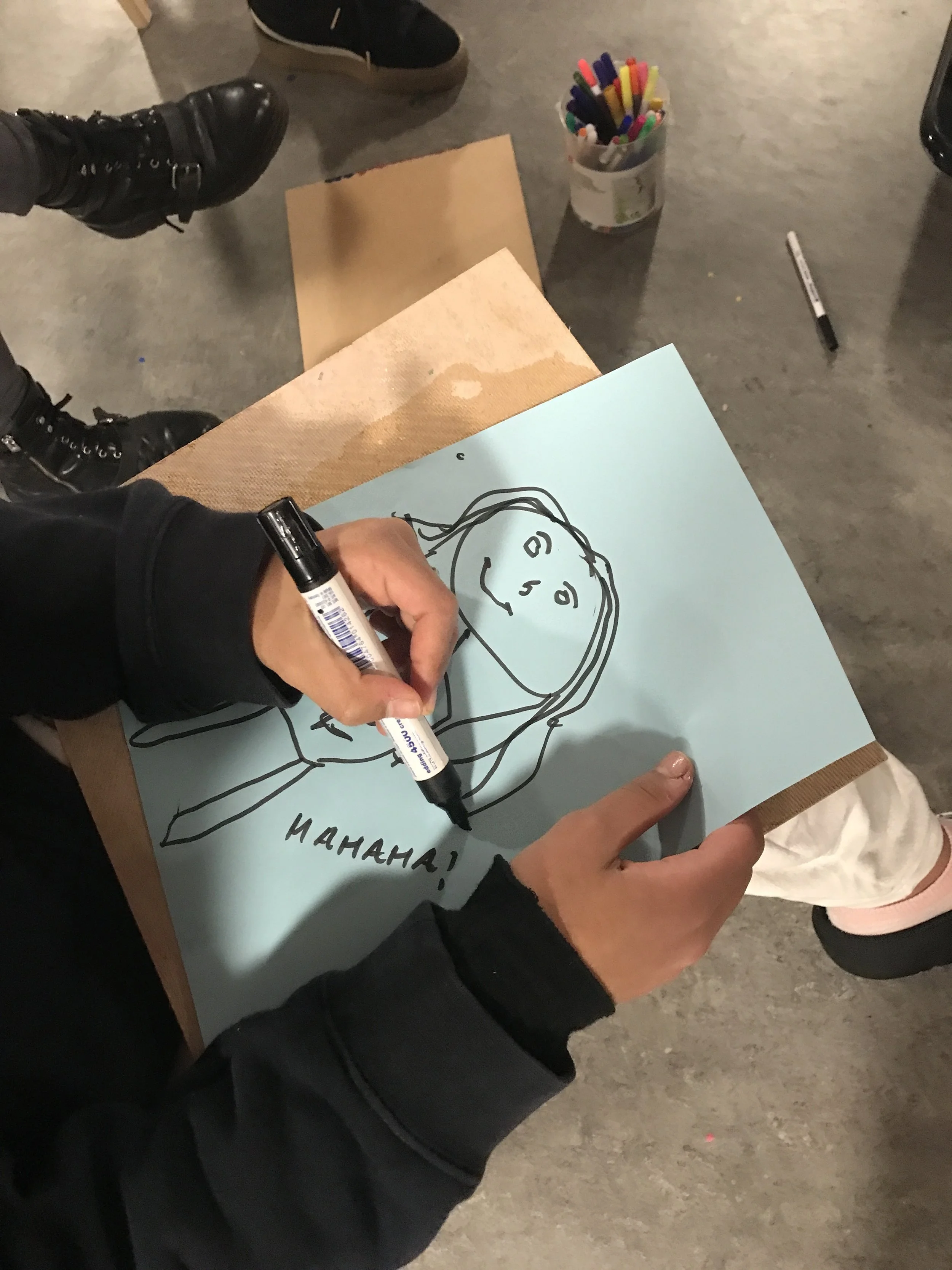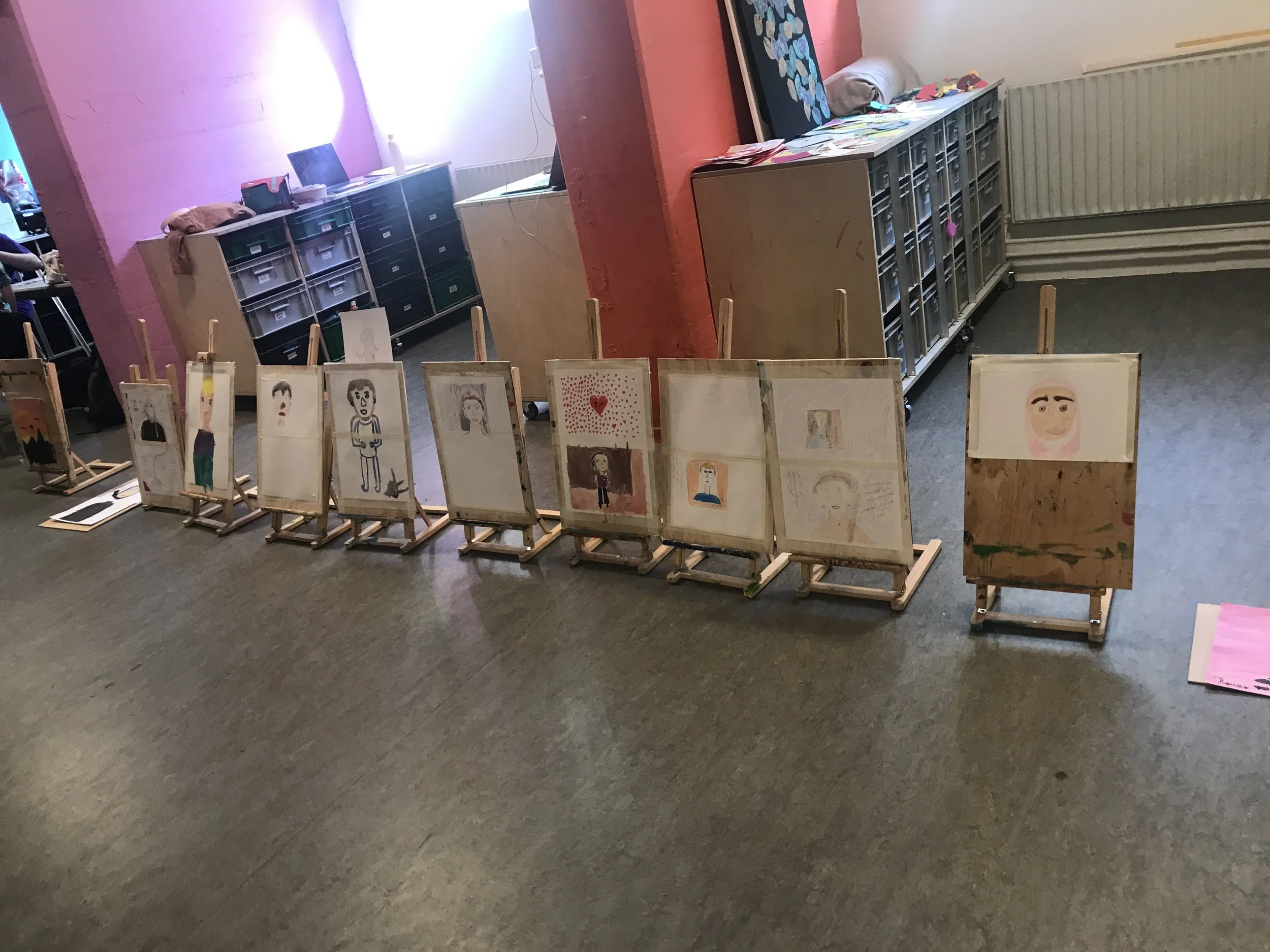 Portraits of each other, using our non dominant hand, given freedom with colouring.