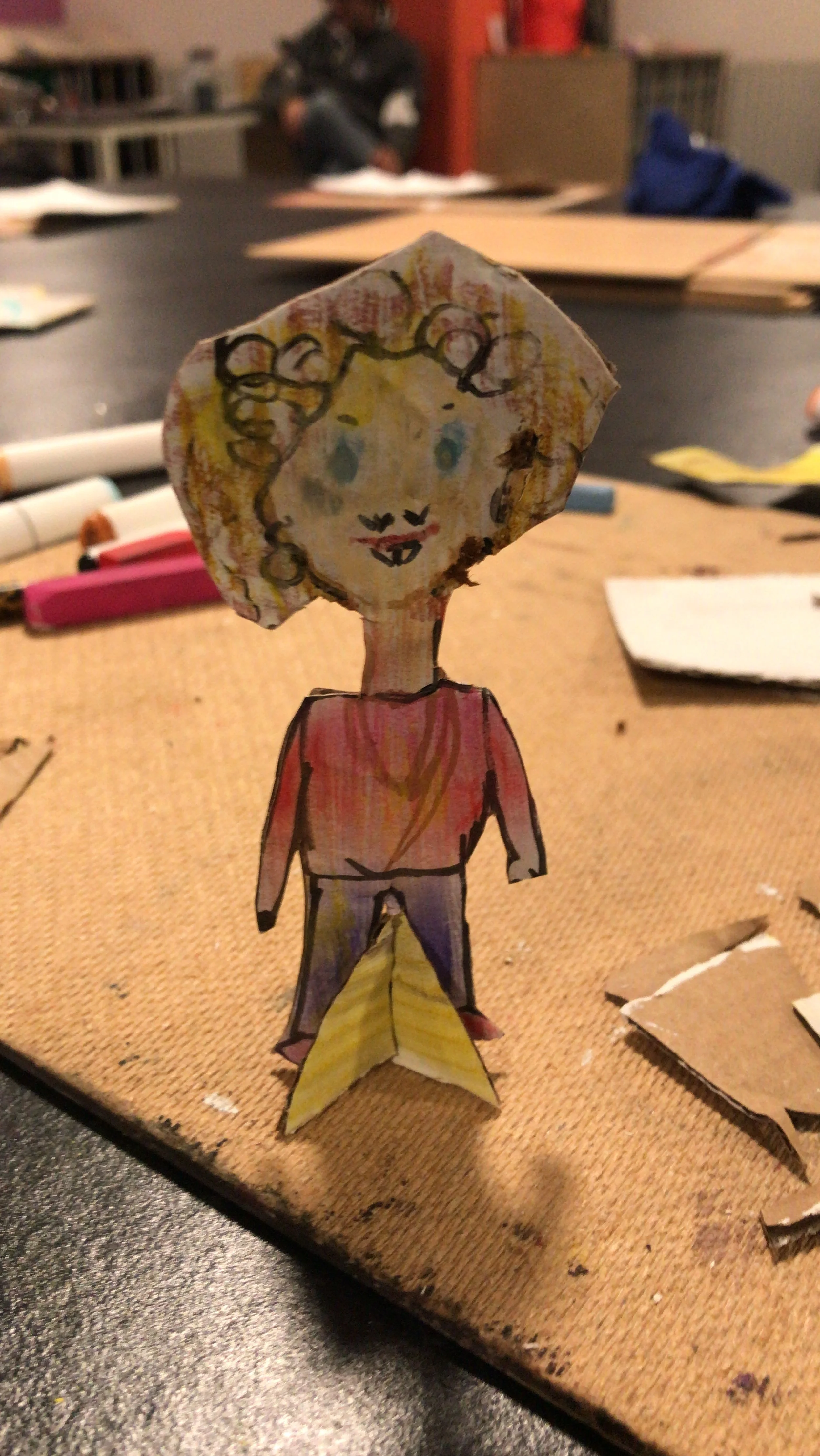 Using cardboard, acrylic, crayons, pencils, pens and markers we made little paper dolls.
